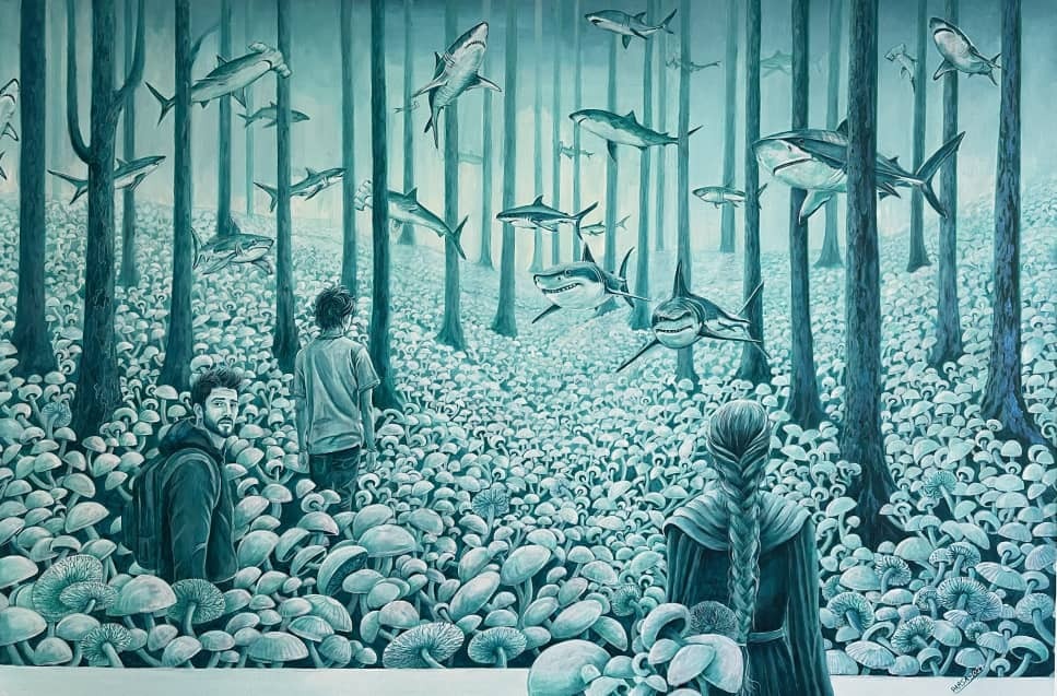 Within this suspended ecosystem, sharks drift between the trees—symbols of hidden threats, external forces, and individuals who, silently and invisibly, hinder our growth and progress.